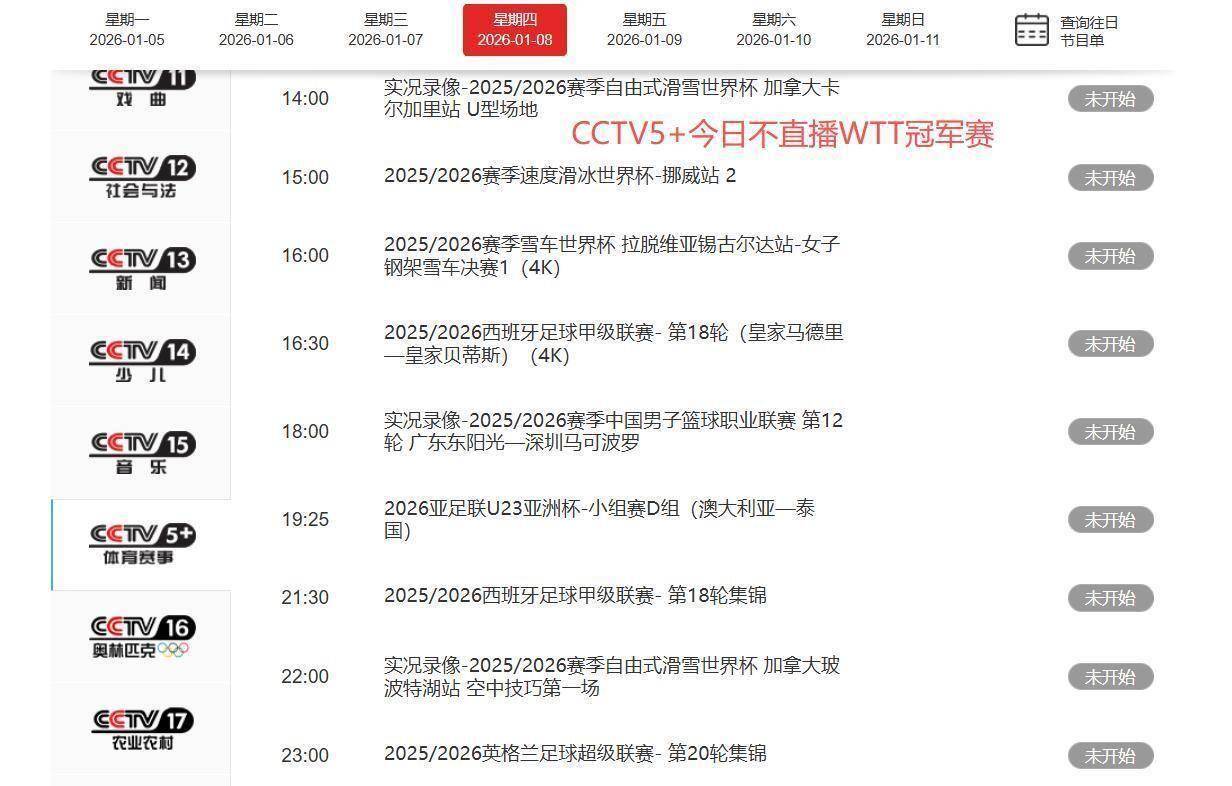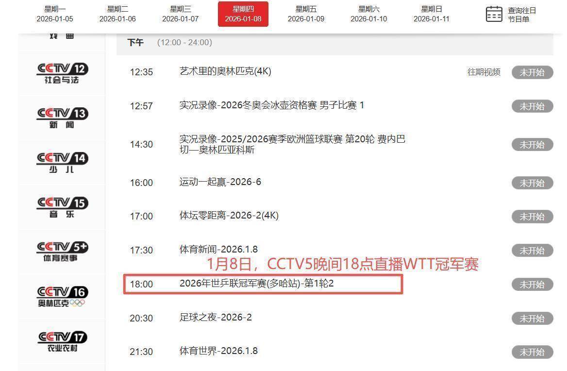 央视直播计划的调整让更多观众有机会关注这场开年大赛。 CCTV5将在晚上18点开始直播今天的焦点赛事而CCTV5+频道今天则不转播乒乓球比赛。 这是因为晚上21点55以后CCTV5要转播U23亚洲杯中国男足对阵伊拉克的比赛所以那个时间段不会播乒乓球。 想观看全程直播的球迷可以转向咪咕视频或者央视频APP这些网络平台不受电视节目时段限制。
