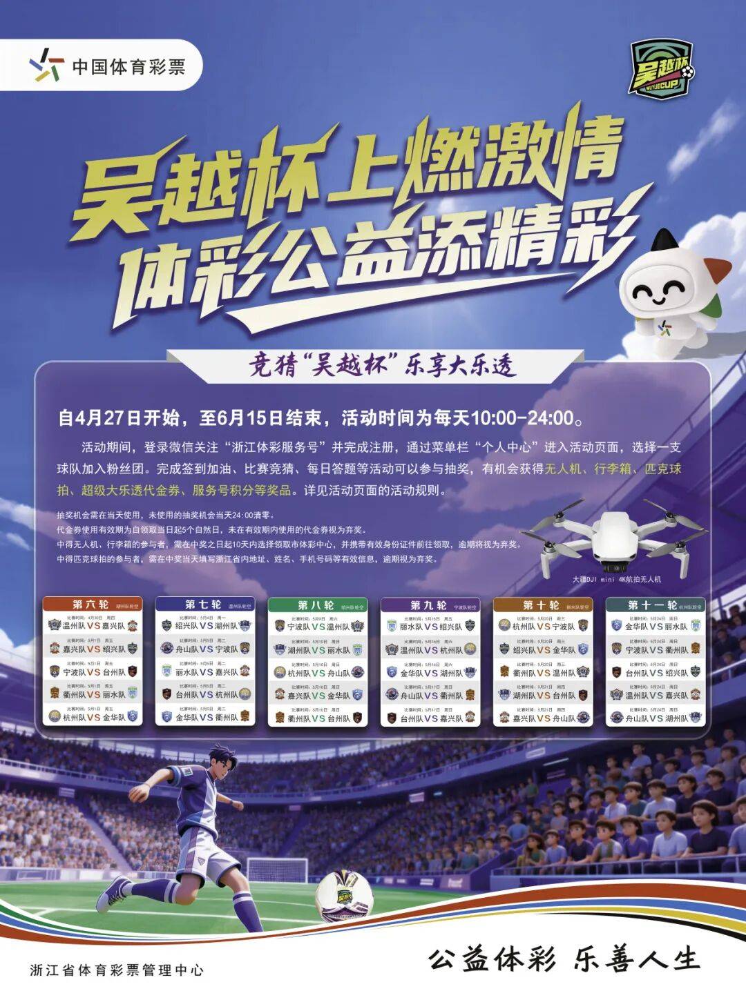无法亲临现场?线日起,关注“浙江体彩服务号”并完成注册,进入“吴越杯”活动页面,即可参与线上竞猜。选择你的主队为其加油,前10000名支持者直接获得5次抽奖机会;每日竞猜赛事胜负、签到助威、答题涨知识,赢取抽奖机会,兑换大疆无人机、TeamChina定制行李箱、匹克球拍、大乐透代金券等好礼。