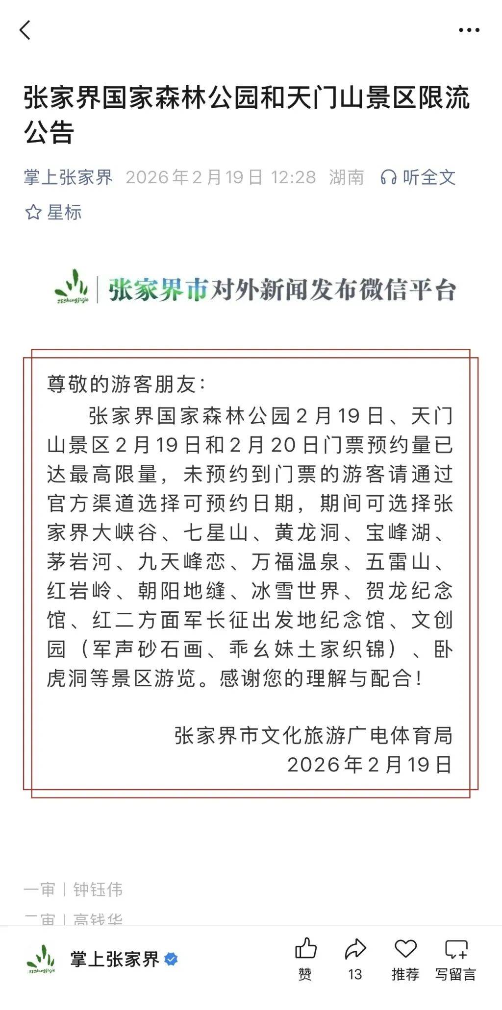如张家界市文化旅游广电体育局发布的消息显示,张家界国家森林公园2月19日、天门山景区2月19日和2月20日门票预约量已达最高限量……