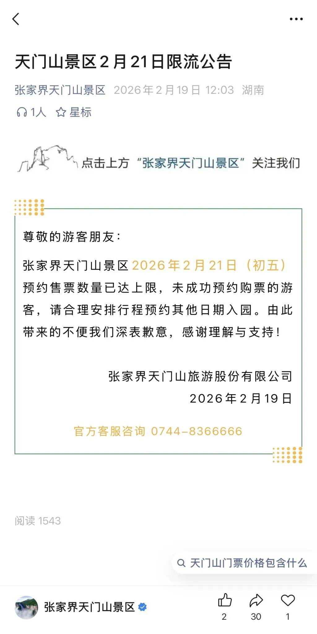 当日12:03,张家界天门山景区还发布公告称,张家界天门山景区2026年2月21日(初五)预约售票数量已达上限,未成功预约购票的游客,请合理安排行程预约其他日期入园。