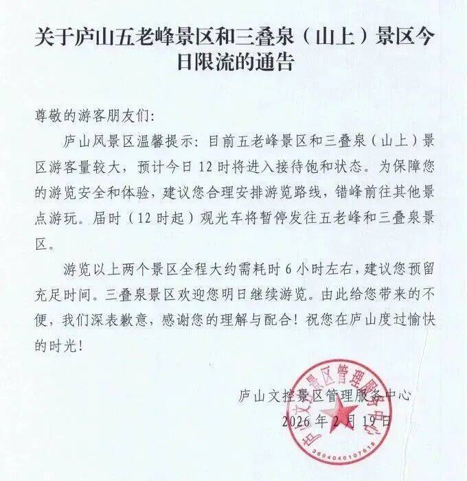 当日14:33,庐山风景名胜区再次发布公告,庐山核心景区(山上)客流量持续高位运行,2月19日(大年初三)预约售票数量已达上限。